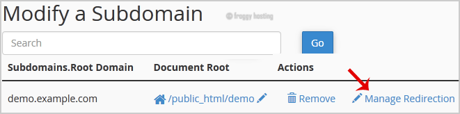 4. Click the "Manage Redirection" link that corresponds to the subdomain that you wish to manage.